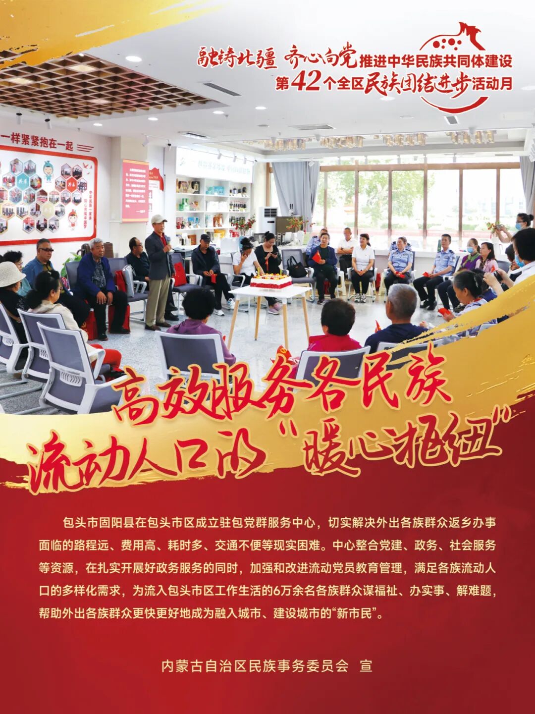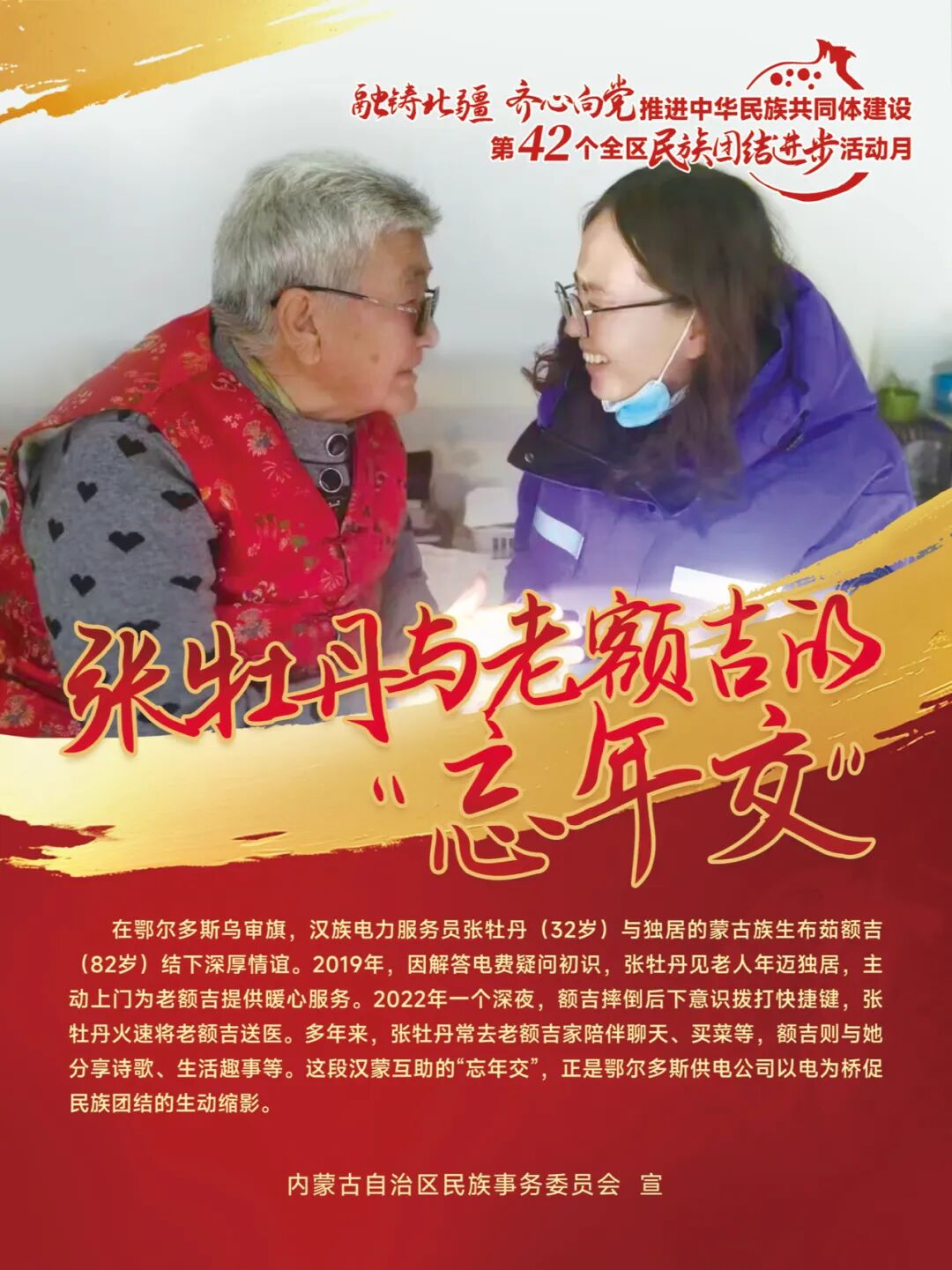 2025年9月是第42个全区民族团结进步活动月。为做好第42个全区民族团结进步活动月工作,深入学习宣传习近平总书记关于加强和改进民族工作的重要思想,生动讲好新时代内蒙古民族团结进步故事,自治区民委广泛征求民族团结进步主题素材、认真提炼总结民族团结进步故事,精心设计制作推出第42个全区民族团结进步活动月主题系列海报,现进行广泛推广和宣传,欢迎大家下载使用、积极转载,共同讲好新时代内蒙古推进中华民族共同体建设故事!