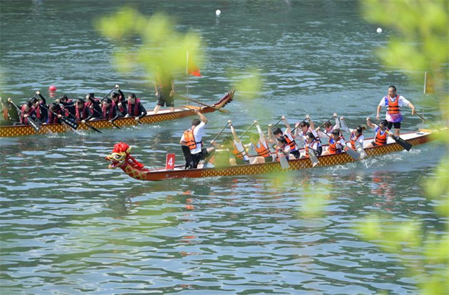 2024年8月10日,湖北省恩施土家族苗族自治州宣恩县城区贡水河上,选手在第十二届全国少数民族传统体育运动会“同心畅享”系列活动——全国龙舟邀请赛200米直道赛预赛中。新华社发(宋文摄)