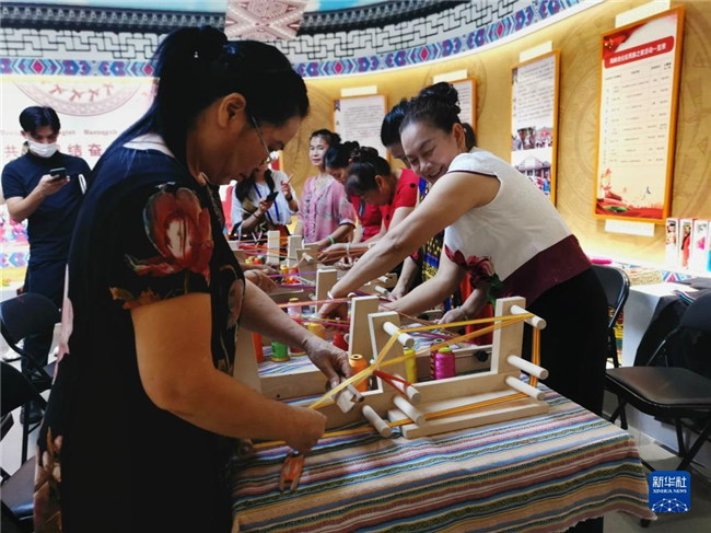 在广西南宁市青秀区凤岭北社区民族之家,社区居民在用简易织机制作壮锦(2020年7月21日摄)。新华社记者 黄庆刚 摄