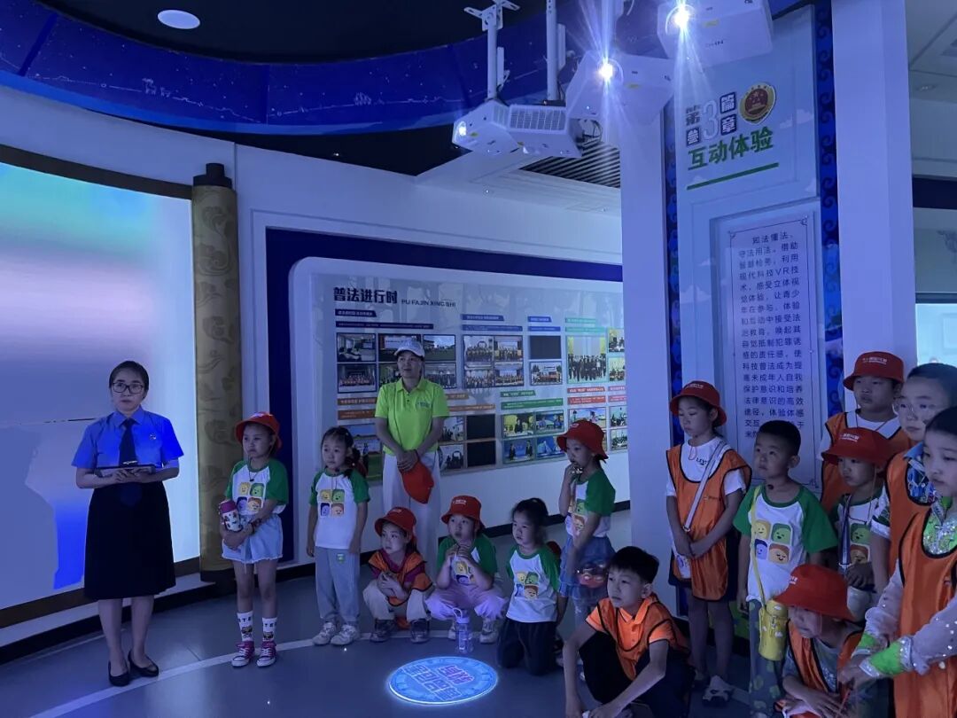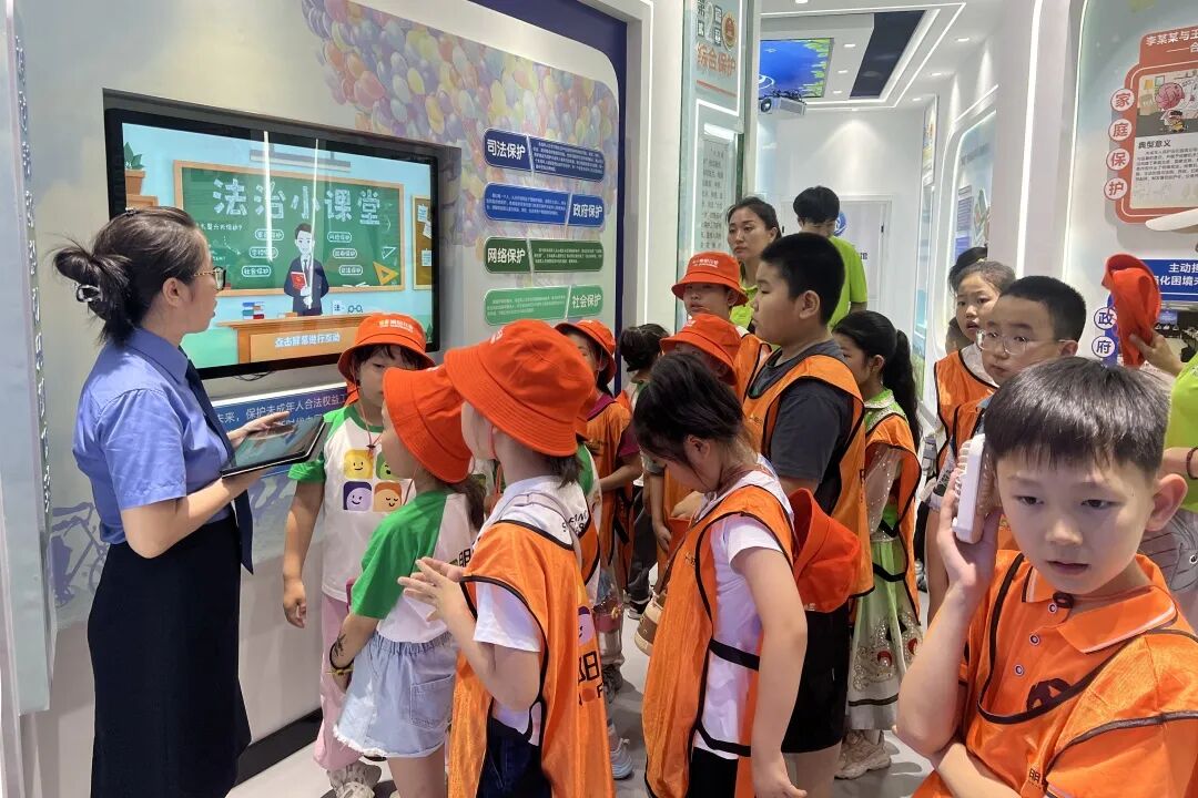 在“法治导游”的带领下,孩子们来到了本次研学的终点站---青少年法治教育基地,开启深度“探秘”之旅。基地依托先进的设施与丰富的展陈内容,将抽象的法律知识可视化,孩子们还通过VR技术“穿越”到了模拟法庭现场,体验庭审流程。在“法律知识小擂台”环节里,孩子们通过趣味儿抢答游戏,加深对法律知识的理解。最后,“法治导游”结合案例与数据,通过动画专区的动画,深入浅出了对孩子们讲解了暑期防溺水、交通安全、居家安全、网络安全等高发安全风险及防范措施,提醒孩子们要时刻守住安全底线。