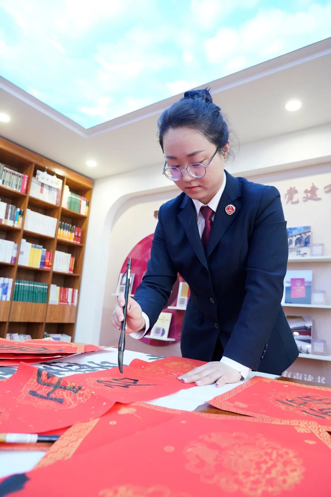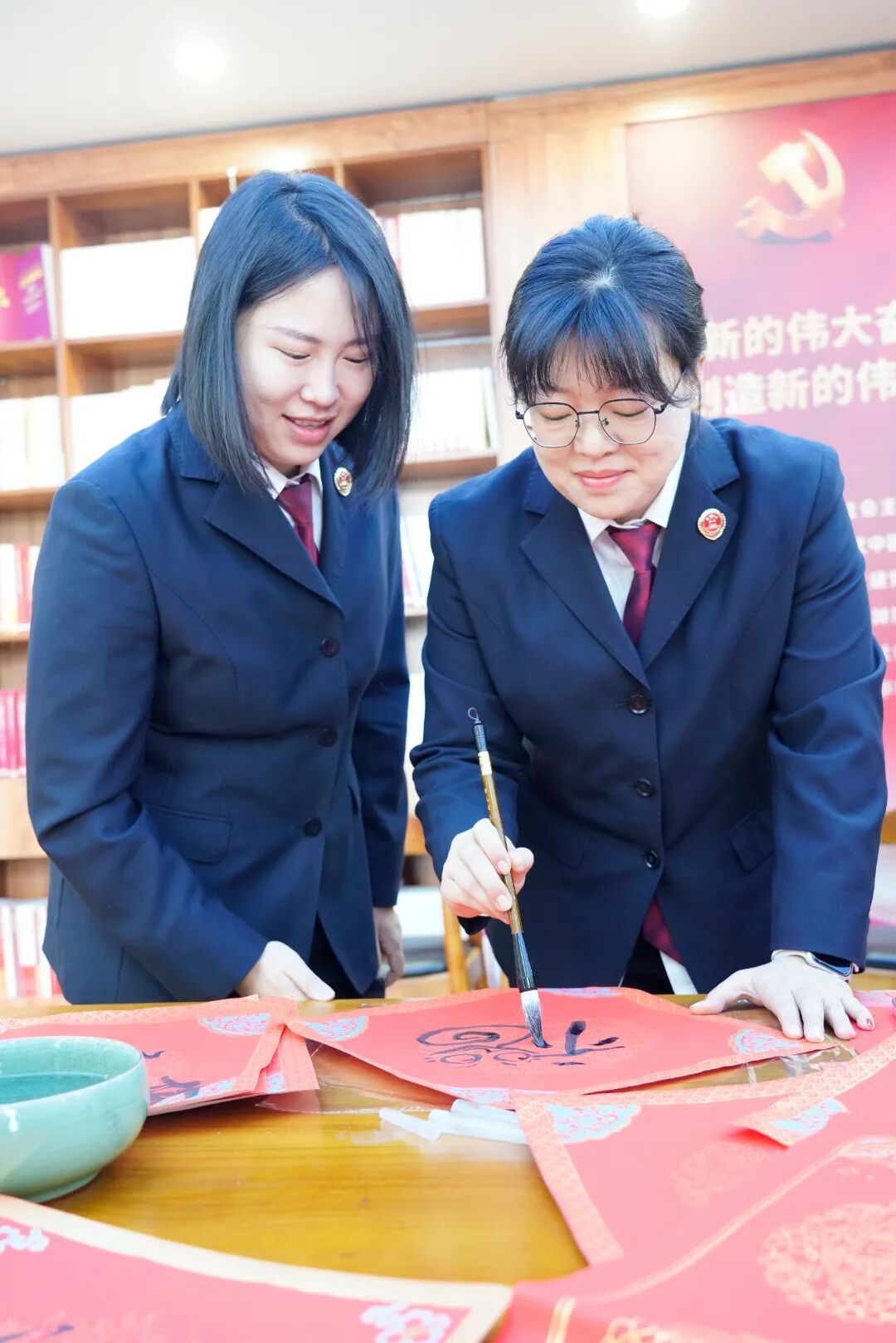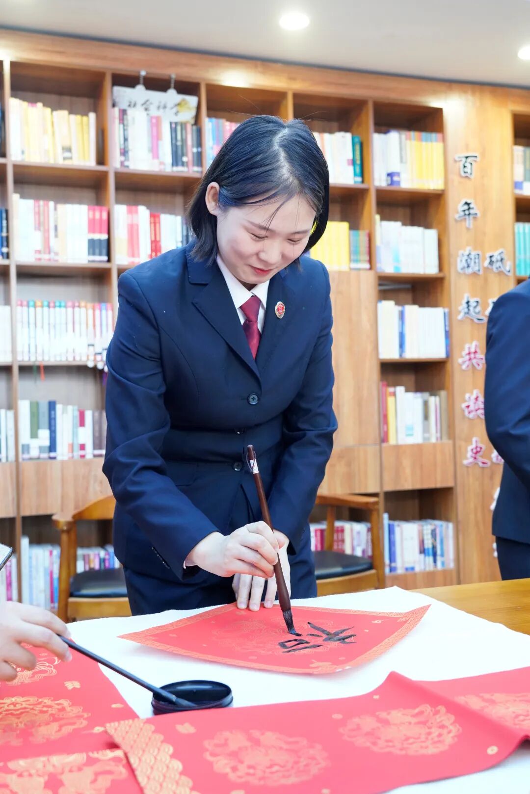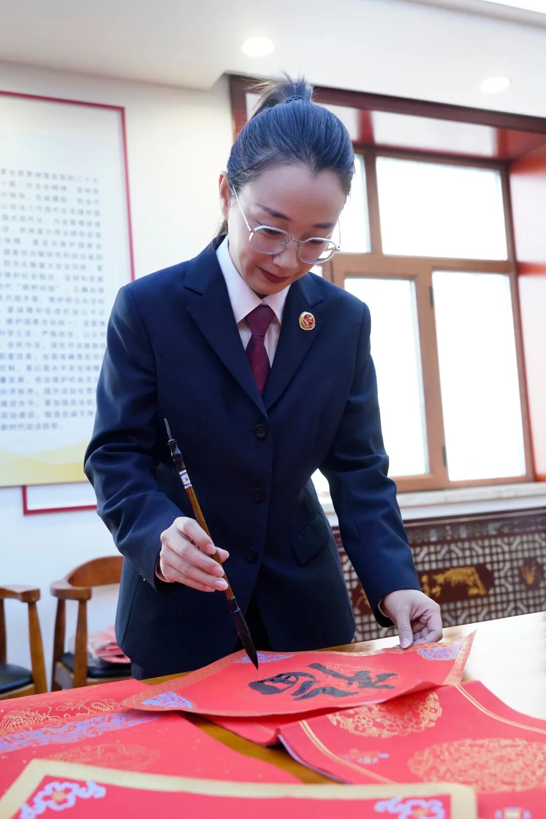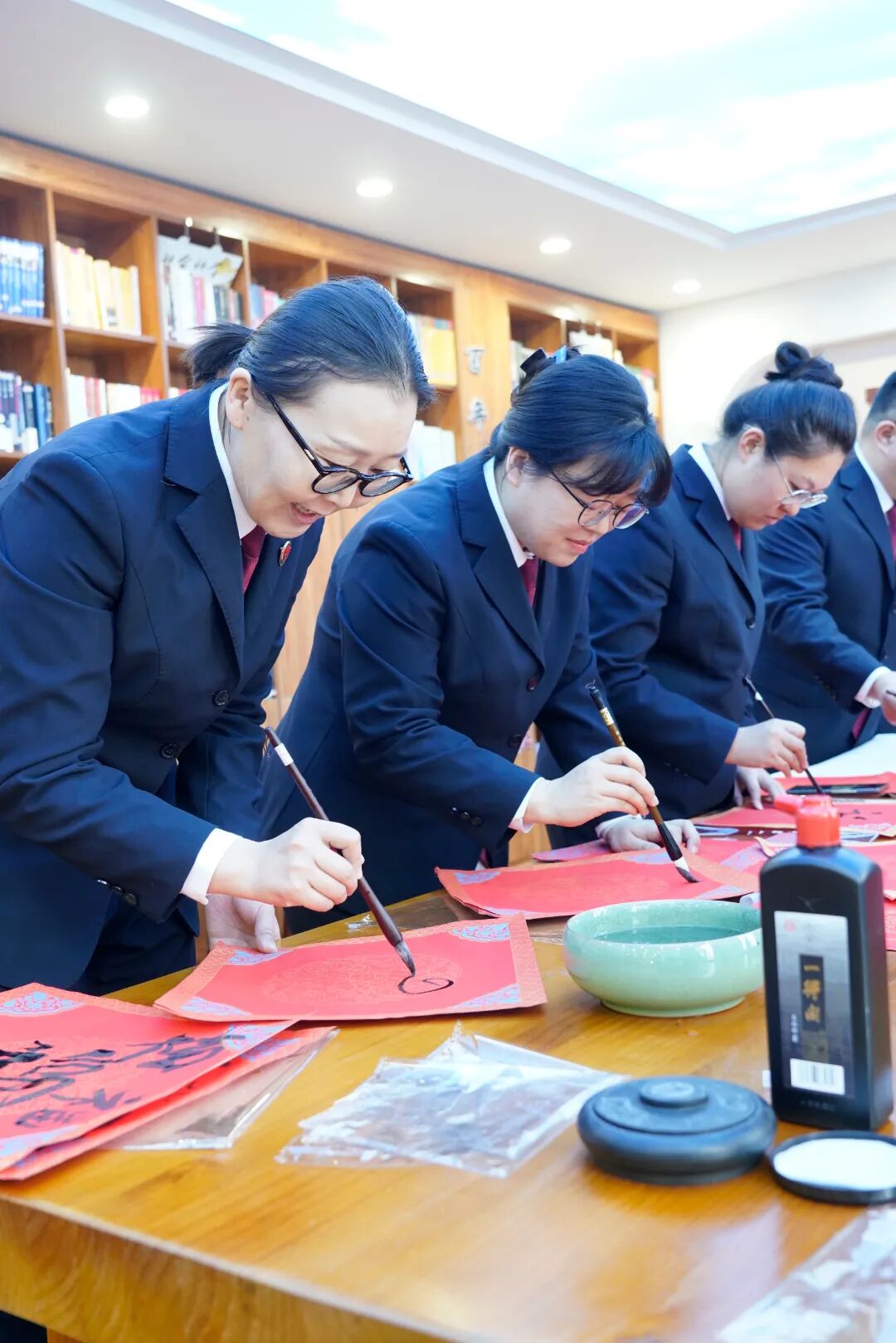 活动现场气氛温馨而喜庆,检察人员挥毫泼墨,将新春祝福融入笔端,精心创作的福字和春联,大家都毫不逊色,即兴挥笔,一幅幅笔酣墨饱、气韵生动的福字和对联很快铺满了活动现场,宛如一片红色的海洋,笔迹未干的书法作品散发着清新的墨香,字里行间洋溢着浓浓的年味儿。